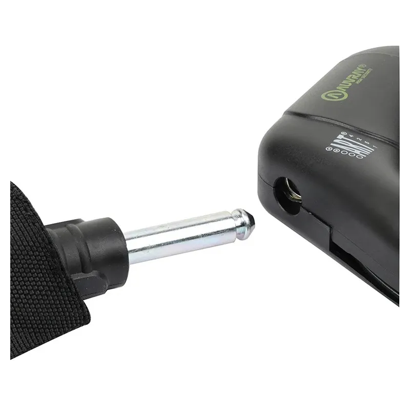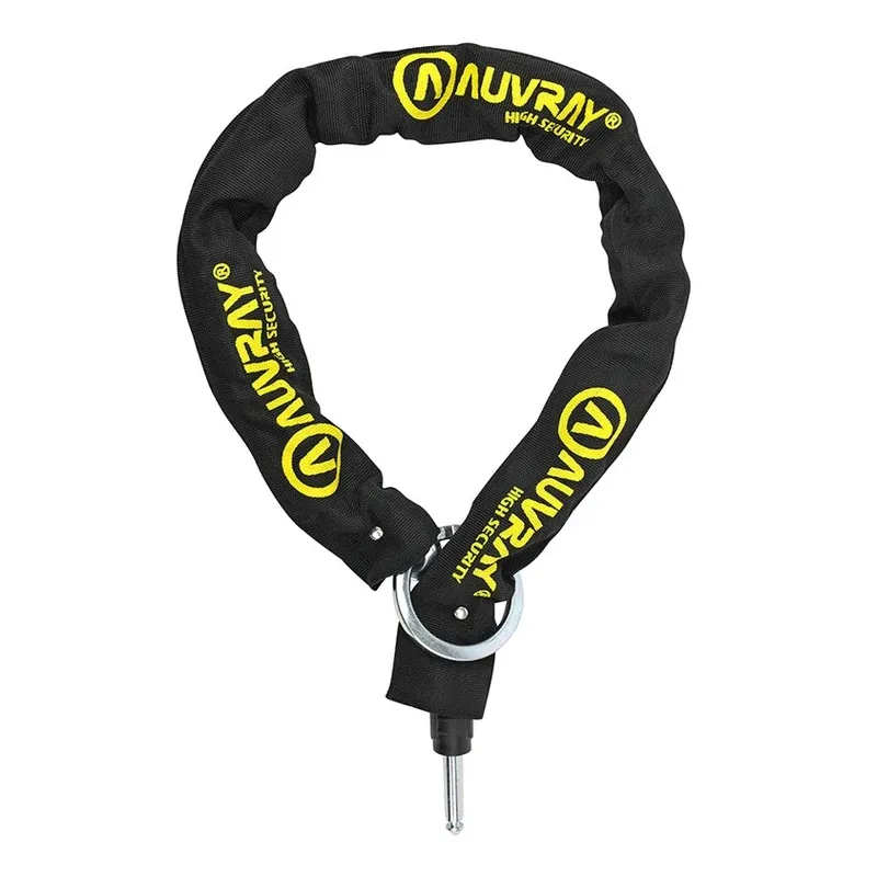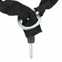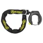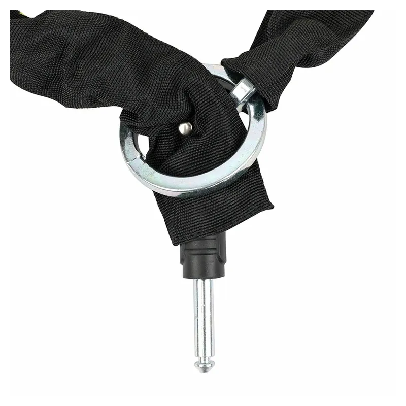 La chaîne lasso Ø 8,5 mm, d’environ 90 cm de longueur, vient se connecter directement à l’antivol grâce à un système plug intégré. Elle permet d’attacher le vélo à un point fixe (poteau, arceau) ou de sécuriser plusieurs éléments du vélo comme le cadre et une roue. Elle est protégée par une gaine textile pour éviter les rayures.
