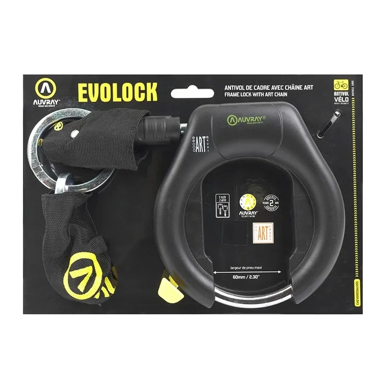 Le SET EVO LOCK + CHAÎNE CHEVO900AUV85 d’Auvray est un système complet de sécurisation pour vélo, combinant un antivol de cadre type “fer à cheval” et une chaîne lasso haute sécurité.