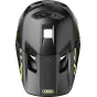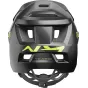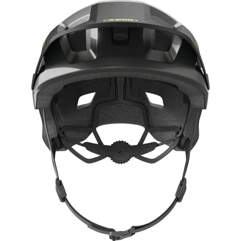 Visière amovible break-away fixée par velcro, se détachant en cas de chute pour limiter la pression sur la nuque.