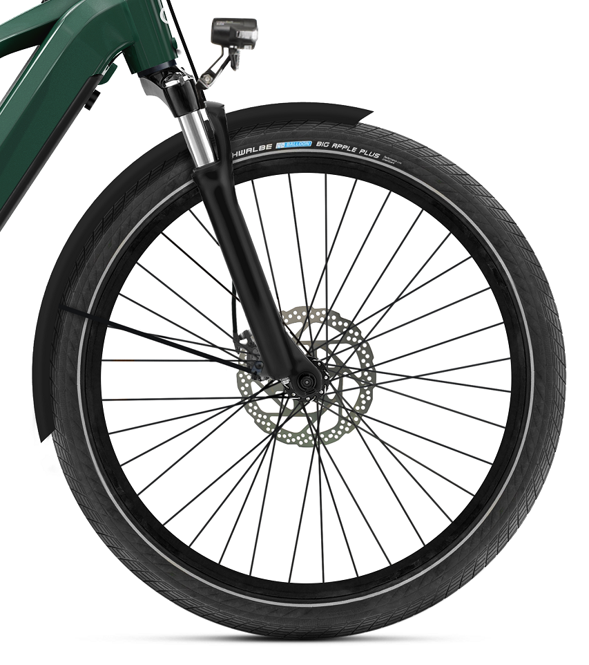 L’Equo 3.1 est livré avec tout l’équipement nécessaire pour un usage urbain : garde-boues, béquille double stable, éclairage avant et arrière AXA, selle confortable Selle Royal avec poignée de transport, et pneus larges renforcés pour supporter les charges lourdes.