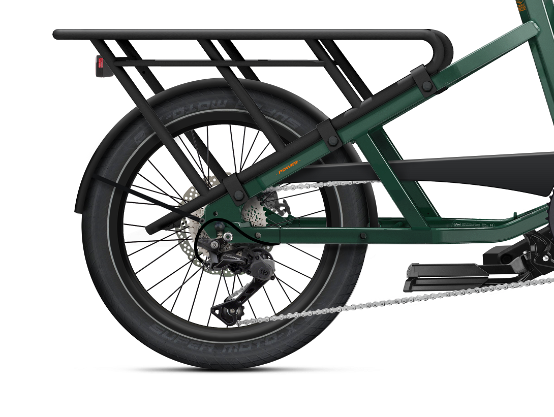 Équipé du nouveau moteur Shimano Steps E6100 E-Cargo, spécialement conçu pour les vélos cargo ce moteur assure une distribution instantanée de la puissance dès 0Km, facilitant des accélérations plus fluides pour les vélos transportant des charges importantes.