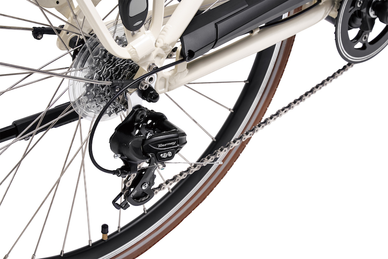 Le Betty dans sa version 2024 est doté du moteur Bafang M300 un moteur particulièrement puissant avec un couple de 80Nm, la batterie située dans le cadre est amovible et sécurisé avec une clé, vous pouvez opter pour une batterie de 418wh ou de 522 wh qui vous assure respectivement une autonomie de 100 et 130 km.