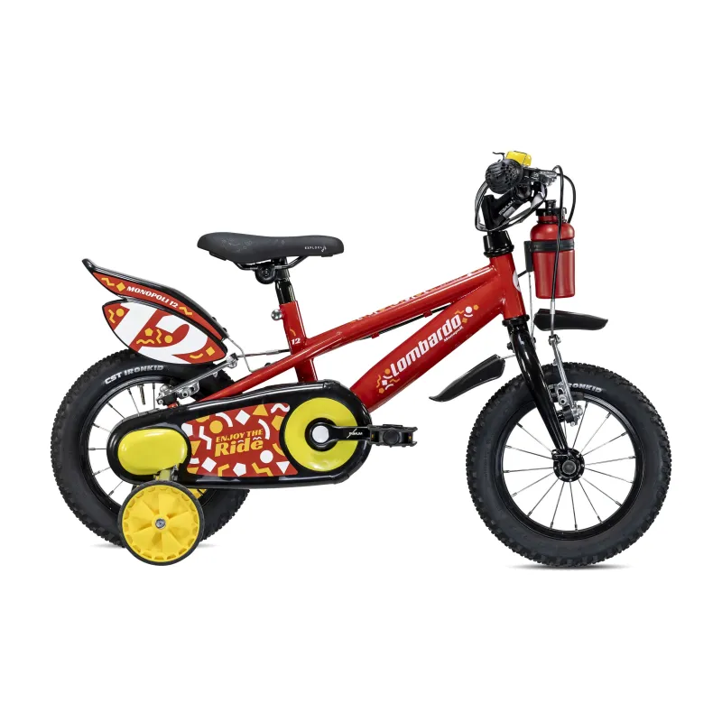 Vélo enfant Monopoli 12 pouces, avec stabilisateurs amovibles pour apprendre en toute sécurité. Équipé de gardes-boue et d’un garde-chaîne protecteur.