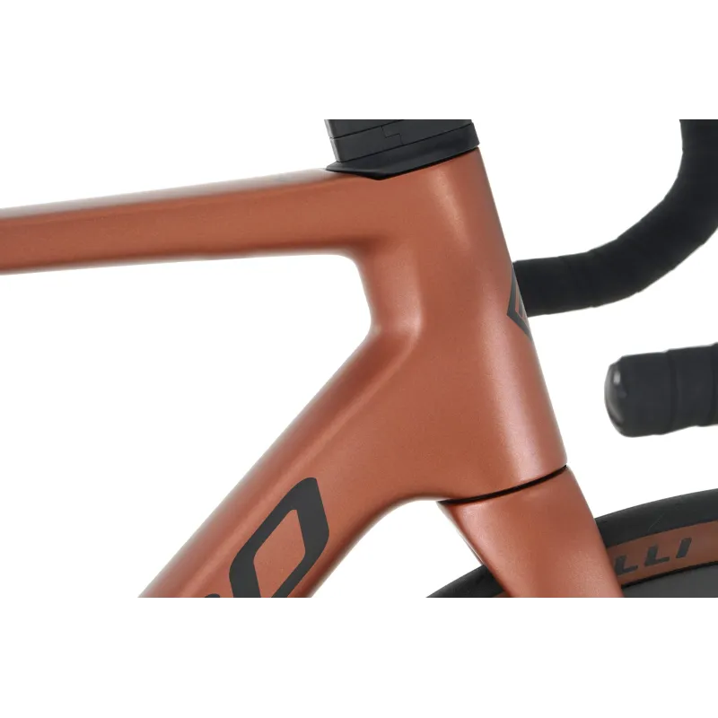 Le poste de pilotage est entièrement intégré, avec un guidon et une tige de selle en carbone, tandis que la selle Selle Italia Novus Boost Evo Superflow complète l’équipement premium.